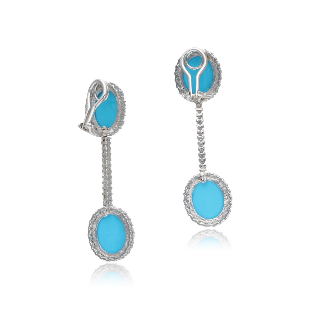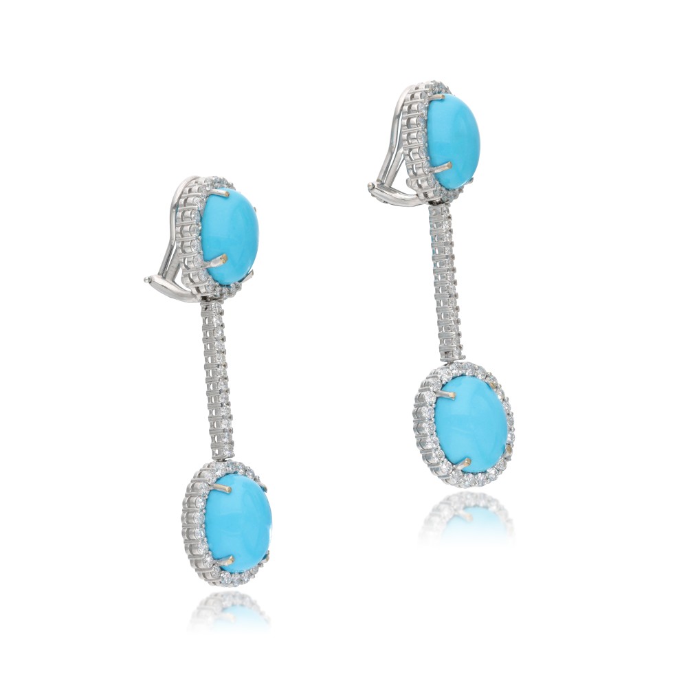 Composed of turquoise cabochons and accented by round brilliant-cut diamonds.