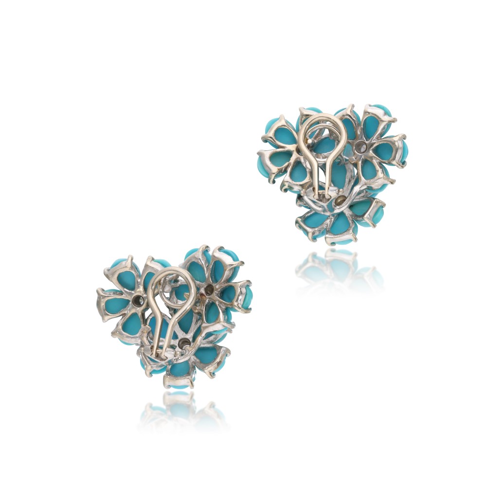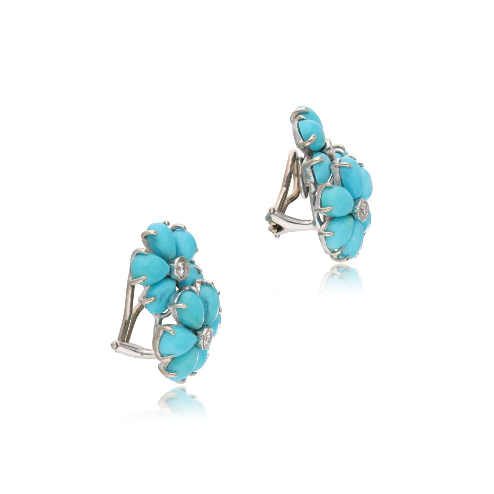 Composed of turquoise cabochons and accented by round brilliant-cut diamonds.