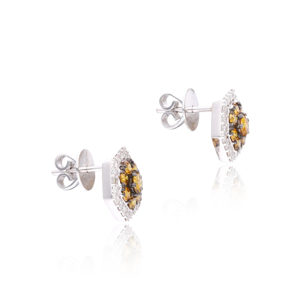 Featuring 8 round yellow diamonds in a hexagon shape on each, accented by round diamonds.