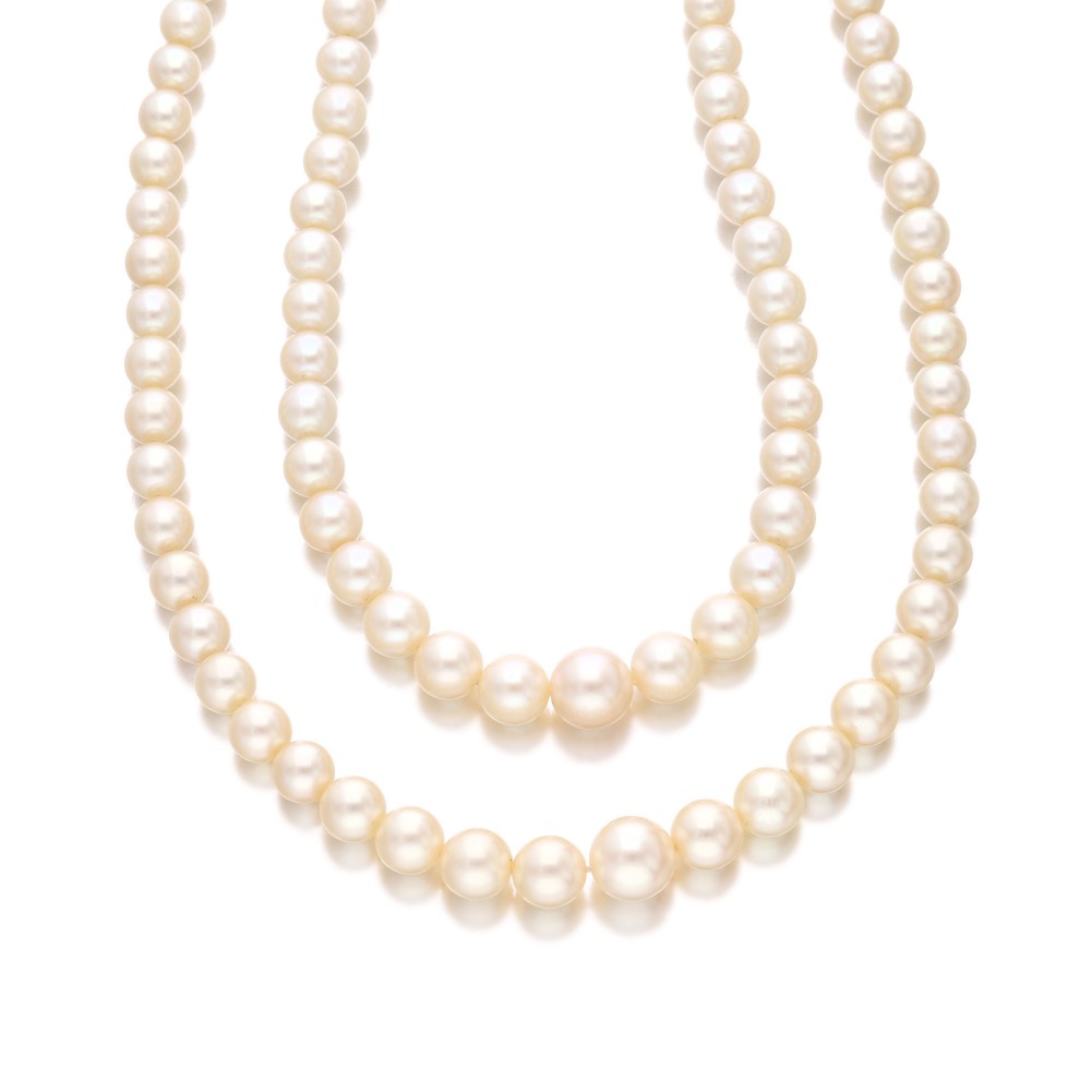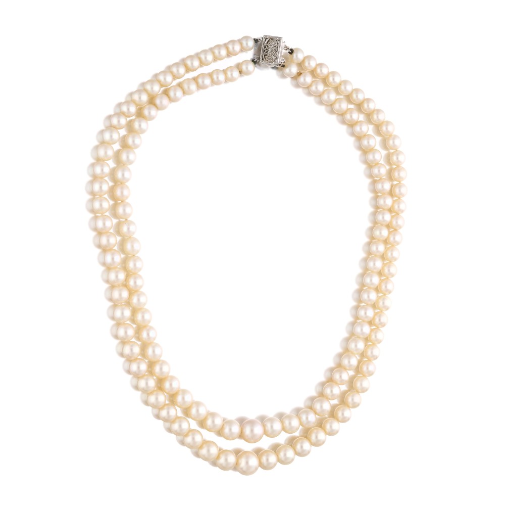 Composed of cultured pearls on a knotted double strand necklace.