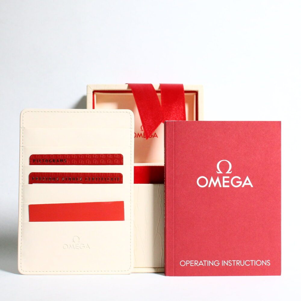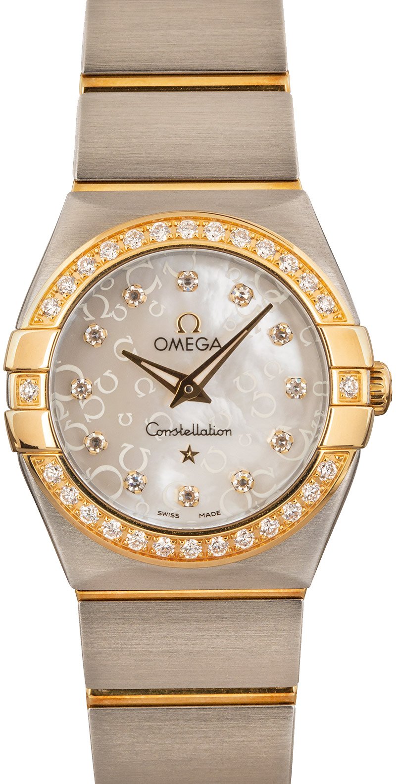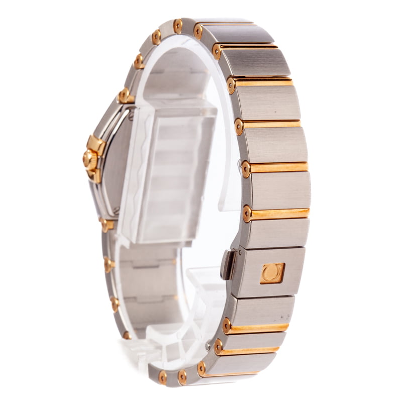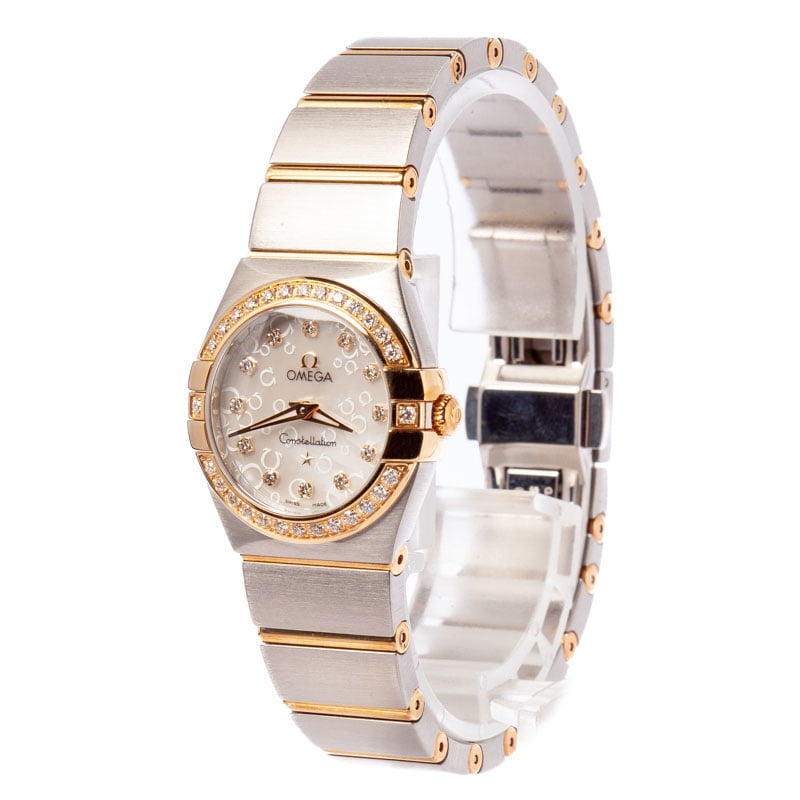 This isn’t just your typical diamond dial Omega. It features a shimmering Mother of Pearl dial decorated with sparkly brilliant-cut diamond hour markers and an Omega logo motif. It’s luxe and sophisticated. We’re confident you will be proud to wear this elegant lady’s dress watch on your wrist for decades to come. The Constellation is distinguished by a Griffe bezel featuring claws on either side of the case. This feature was once used to hold the crystal to the case but is now purely decorative and very characteristic of a famous Omega Constellation. Ref. 123.25.24.60.55.010 is a gorgeous two-tone edition of the series, featuring a stainless steel and 18k yellow gold finish.
