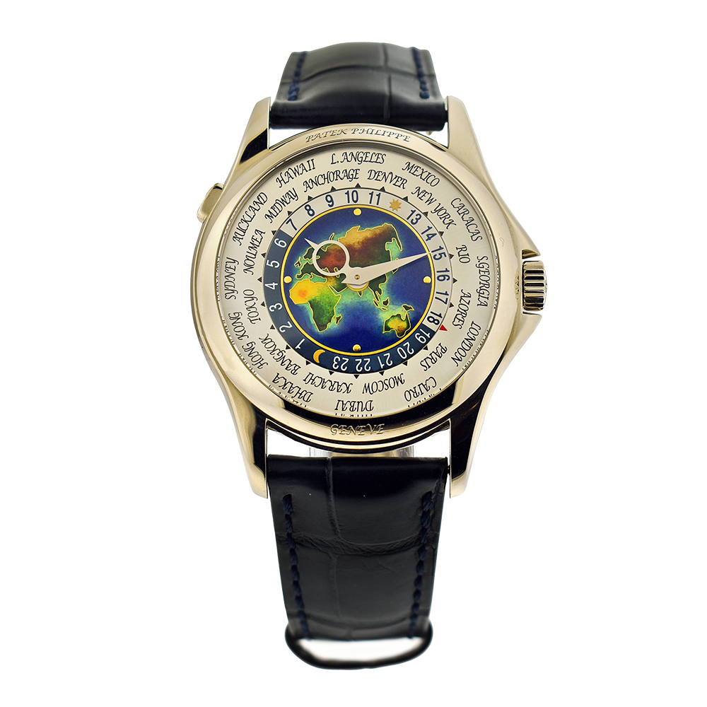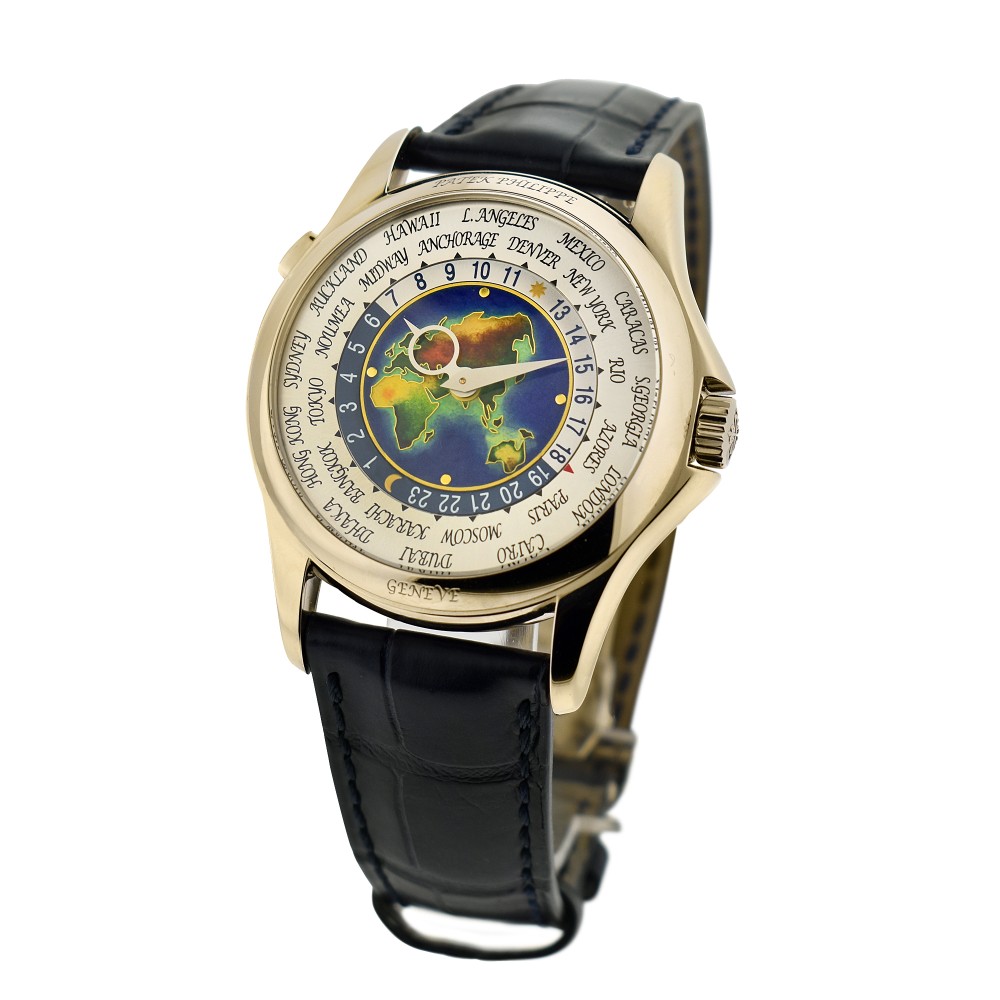 The difficulty of manufacturing these works of art cannot be overstated, given the nature of the enameling process. Utterly thin gold wires were used to outline the continents and only a handful could be heated perfectly without cracking while meeting the color standard by Patek. Surely a joy to look at, the present dial depicts four continents: Europe, Asia, Africa and Oceania, and unlike its successor reference, the Patek Philippe signature was engraved to the bezel without blocking view of the beautiful enamel dial. The scarce production of cloisonn? enamel dials made long waiting lists at the boutique, making this an excellent opportunity to acquire this horological marvel.