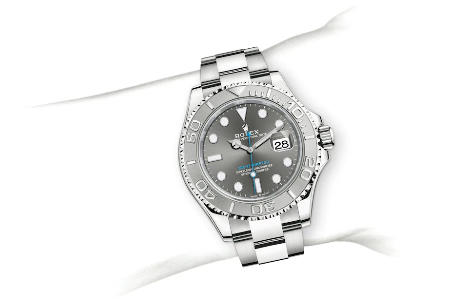 Many Rolex watches are available with the now-legendary combination of yellow, white or Everose gold and steel known as Rolesor, but Rolesium is a creation specific to the Yacht-Master. While the case and bracelet are in rugged Oystersteel, the bezel of the Rolesium versions is made of platinum, imparting a silvery whiteness and vibrant luminosity for an unmistakable sense of luxury.